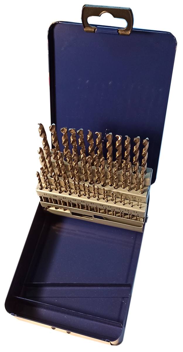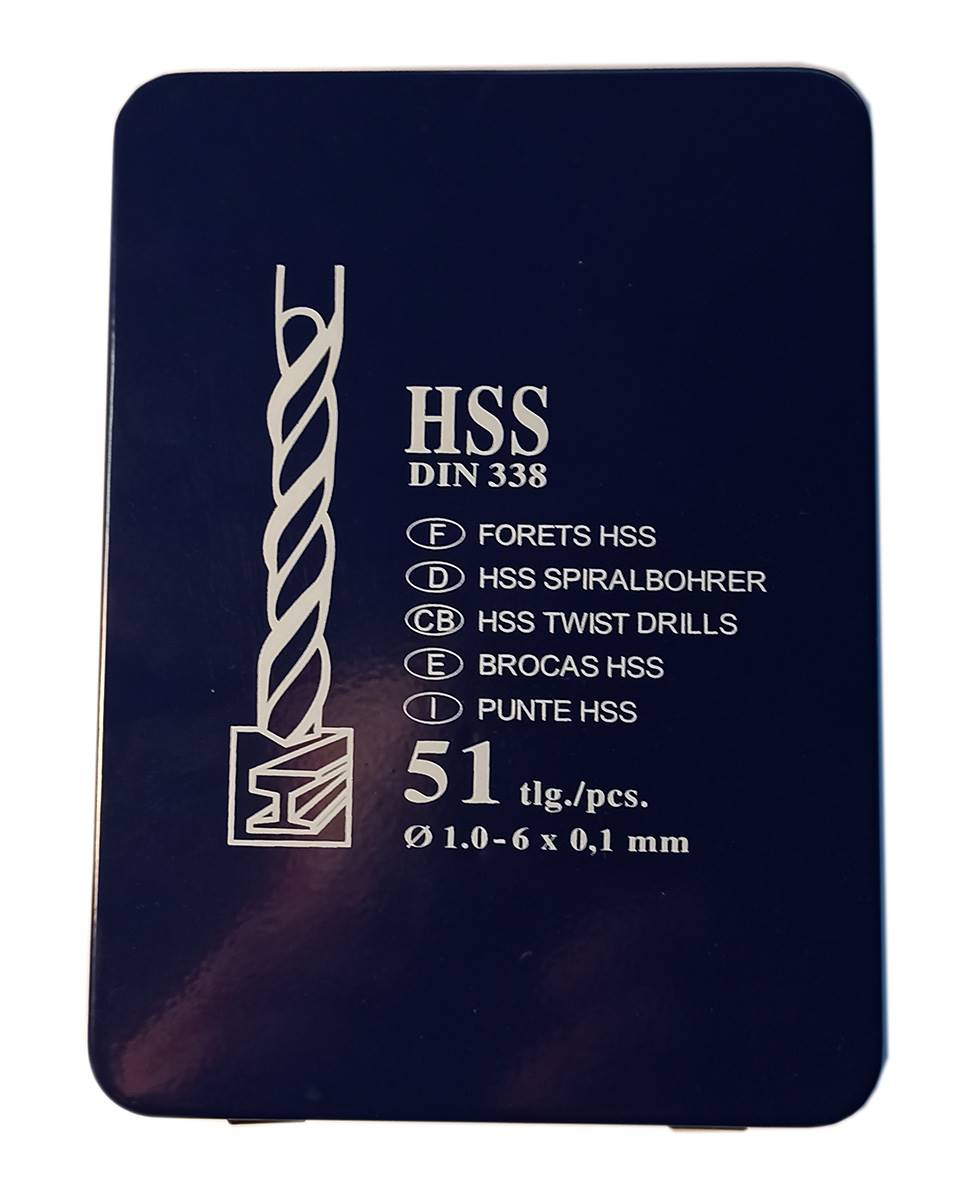 Coffret métallique de 51 forets cylindriques HSS taillés meulés de Ø 1 à Ø 6 par 0,1 mm. Affûtage standard 118°. DIN 338 SP