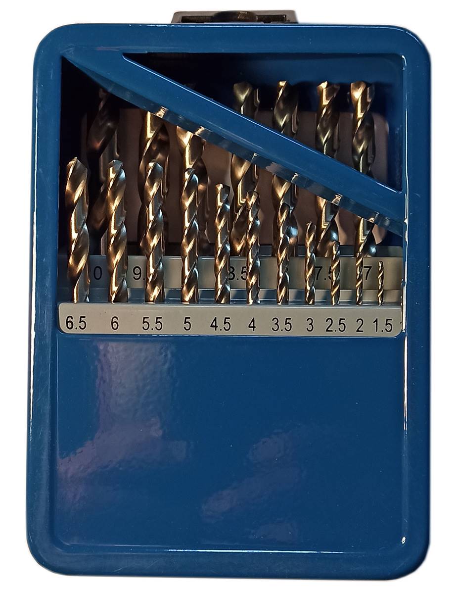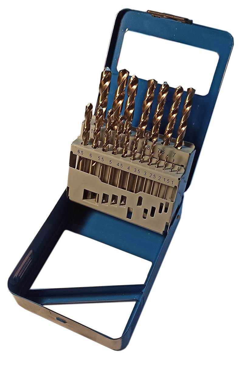 Coffret métallique de 19 forets cylindriques HSS taillé meulé et renforcé, TSX de Ø 1 à Ø 10 par 0,5 mm. Affûtage en croix 135°. Auto-centreur - DIN 338. Type N - Matière à usiner R = 800 N/mm2 - Matière acier HSS - Dureté (64-65 HRC) - Finition acier poli brillant renforcé taillé meulé