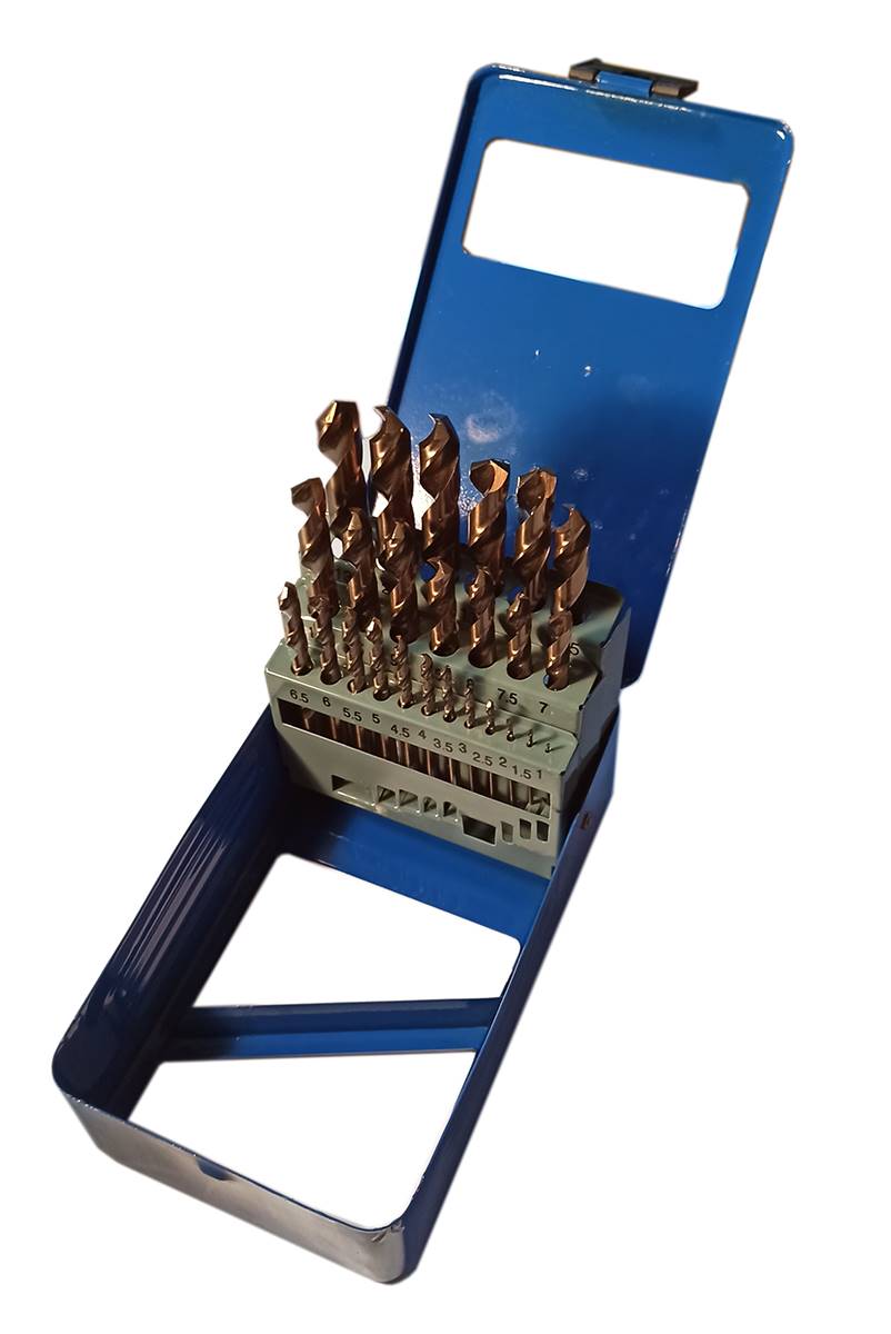 Coffret métallique de 25 forets cylindriques HSSE cobalt 8% M42 taillé meulé, Co8 de Ø 1 à Ø 13 par 0,5 mm. Affûtage en croix 135° - Auto-centreur - DIN 338 - Type N - Matière à usiner R = 1400 N/mm2 - Matière acier HSSE Co8 AISI M42 - Dureté (65-66 HRC) - Finition bronze taillé meulé