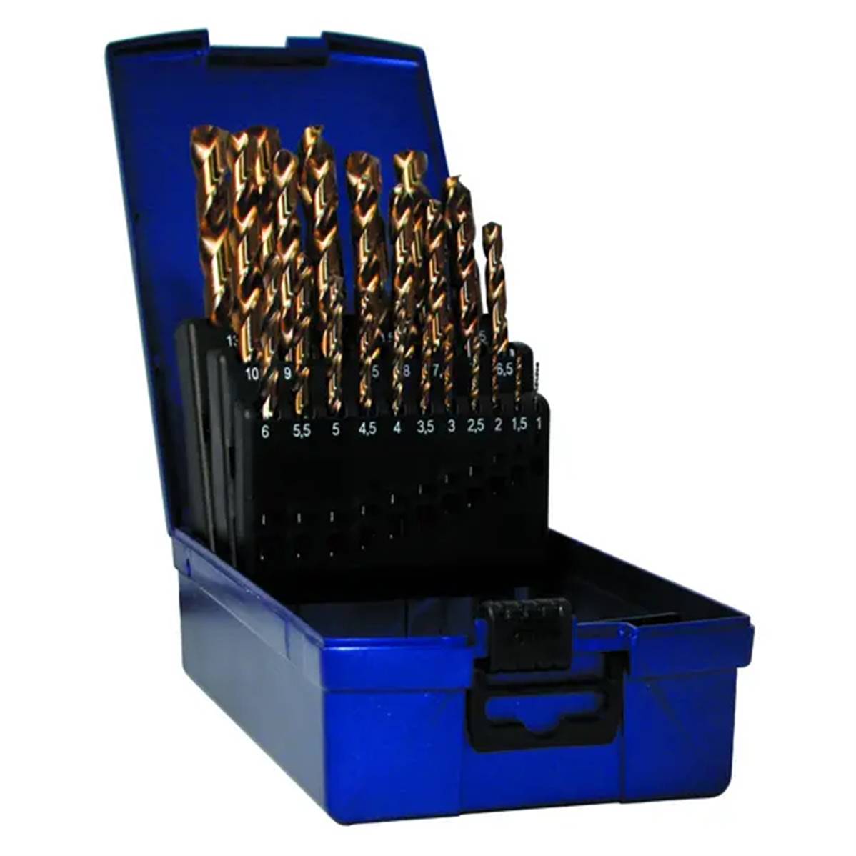 Coffret plastique de 25 forets cylindriques HSSE cobalt 5% M35 taillé meulé, Co5 de Ø 1 à Ø 13 par 0,5 mm. Affûtage en croix 135° - Auto-centreur - DIN 338 - Type N - Matière à usiner R = 1200 N/mm2 - Matière acier HSSE Co5 M35 - Dureté (65-66 HRC) - Finition bronze taillé meulé