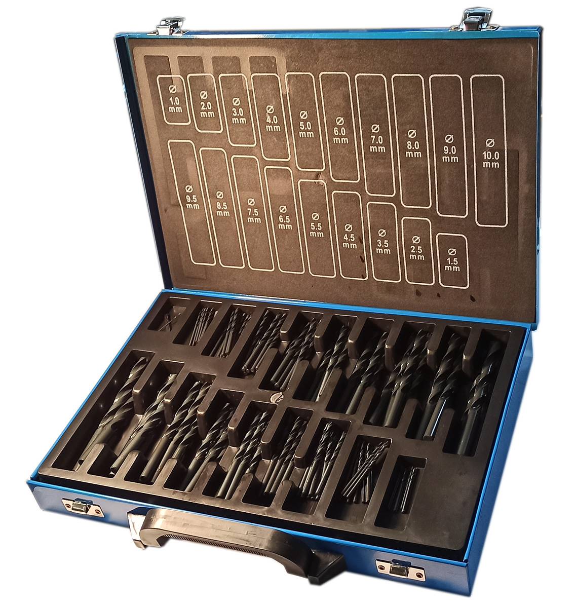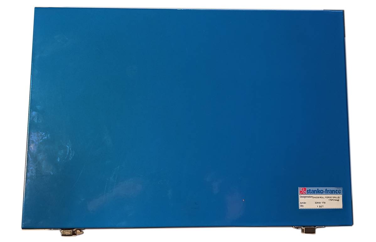 Valise métallique de 170 forets cylindriques HSS laminés de Ø 1 à Ø 10 mm par 0,5 mm. Affûtage standard 118°. DIN 338